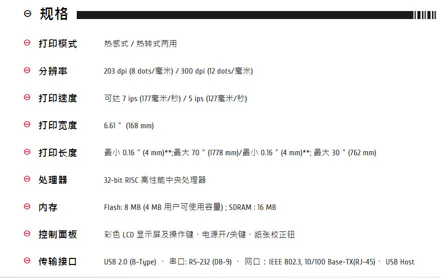 高速熱感打印,速度可達(dá) 7 IPS (177 mm/s)/5 IPS (127 mm/s) ;