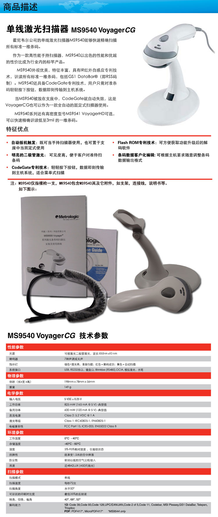 霍尼韋公司的單線激光掃描器MS9540能夠快速精確掃描所有標準一維條碼。作為一款高性能手持掃描器,MS9540以出色的性能和有約的性價比成行業(yè)內的產品。