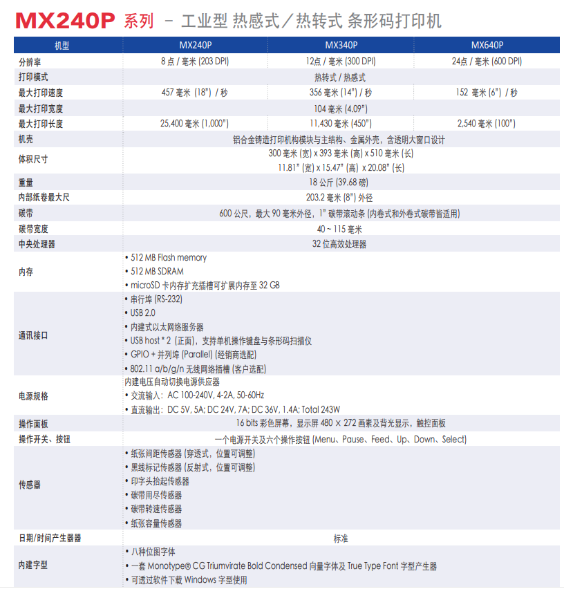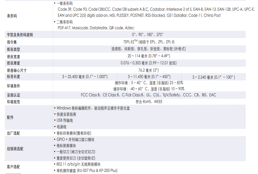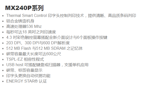 Thermal Smart Control 印字頭控制列印技術(shù),提供清晰、高品質(zhì)條碼列印 鋁合金鑄造機(jī)身 高速處理器536 Mhz 每秒可達(dá)18 英吋之列印速度 4.3 吋彩色觸控螢?zāi)淮钆淙陆槊嬖O(shè)計與6個面板操作按鍵 203 DPI、300 DPI與600 DPI解析度 512 MB Flash 與512 MB SDRAM 之記憶體 碳帶容量最大長度可達(dá)600公尺 TSPL-EZ 相容性程式 USB host 可搭配鍵盤或掃描器,支援單機(jī)應(yīng)用 碳帶、標(biāo)簽容量顯示 印字頭更換自動偵測功能 ENERGY STAR? 認(rèn)證